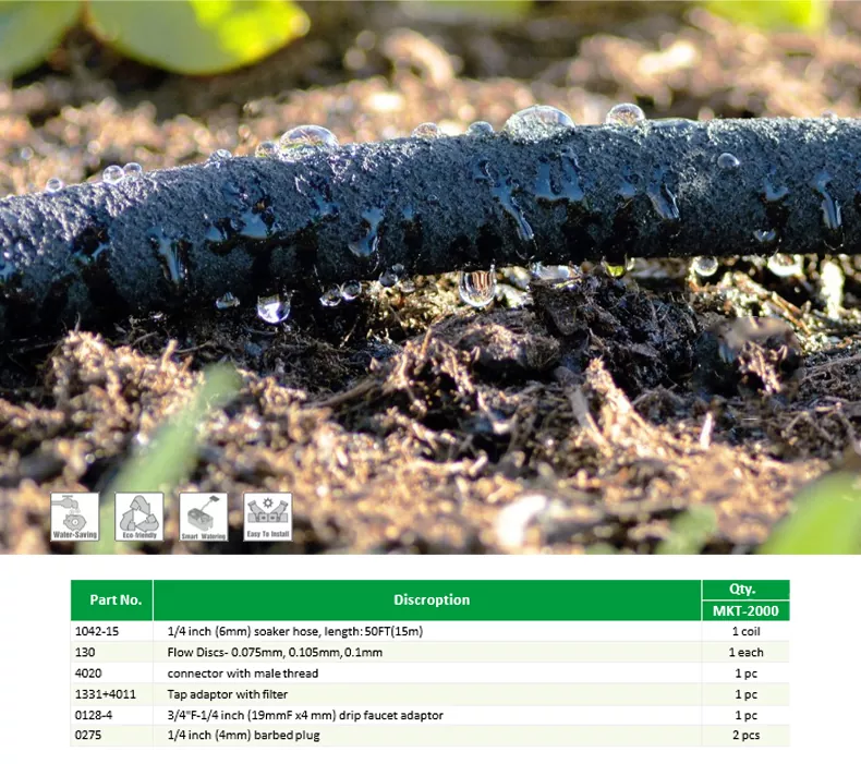 DIY 浸泡软管入门套件 MKT-2000 1、轻松打造高效便捷浇水 适合您花园的系统 2、Soaker软管可节省高达70%的水,节省 您的资金并帮助维持我们的自然资源 3、包含设置浸水软管灌溉所需的一切 系统