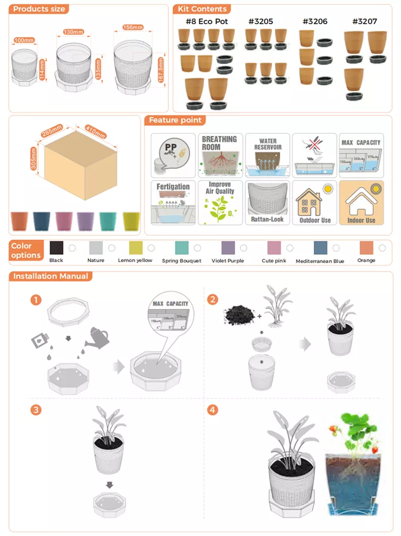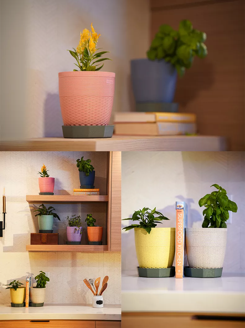 该系列共有三个不同尺寸的花盆。 4英寸的花盆是最小的,5英寸的花盆是中等大小的,6英寸的花盆是最大的。每个花盆都配有一个储水底座。