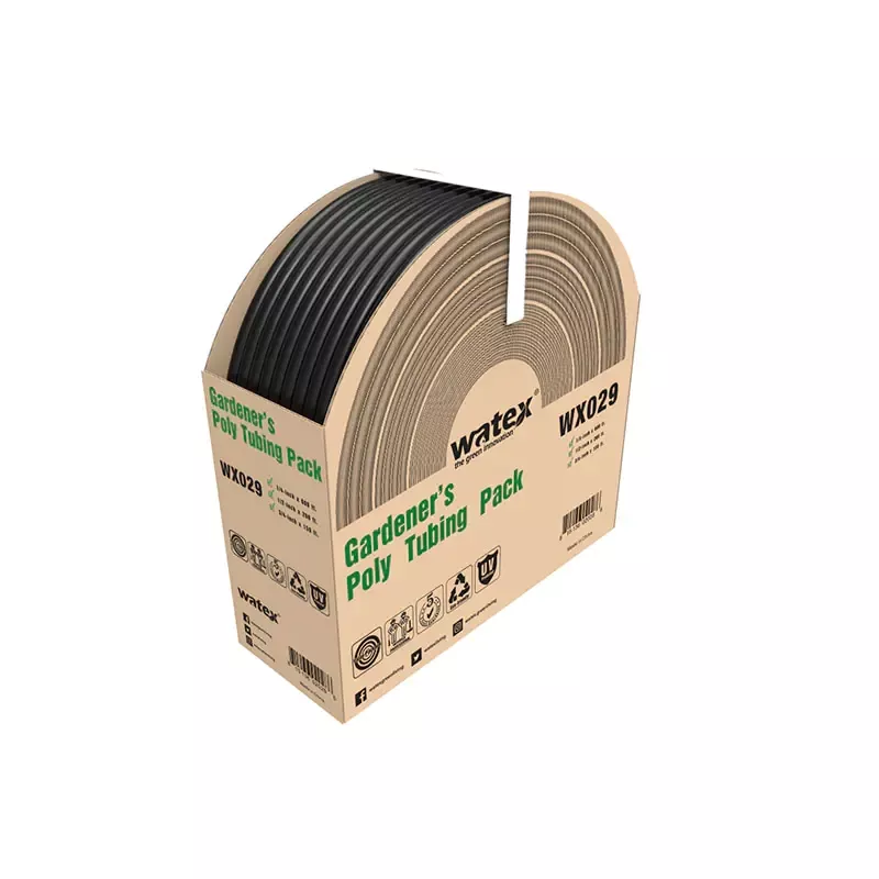 PE/PVC 给水管系列耐用且柔韧,内径有 4mm、13mm、19mm 和 25mm。它易于展开并平放而不会缠结,非常适合规划水源的管道路线并根据所需的流量选择适当的管道尺寸。它与 Watex 配件和管夹兼容,无需工具即可快速连接,安装无忧。末端可连接至 4mm 灌溉毛细管,非常适合标准低压灌溉系统。
