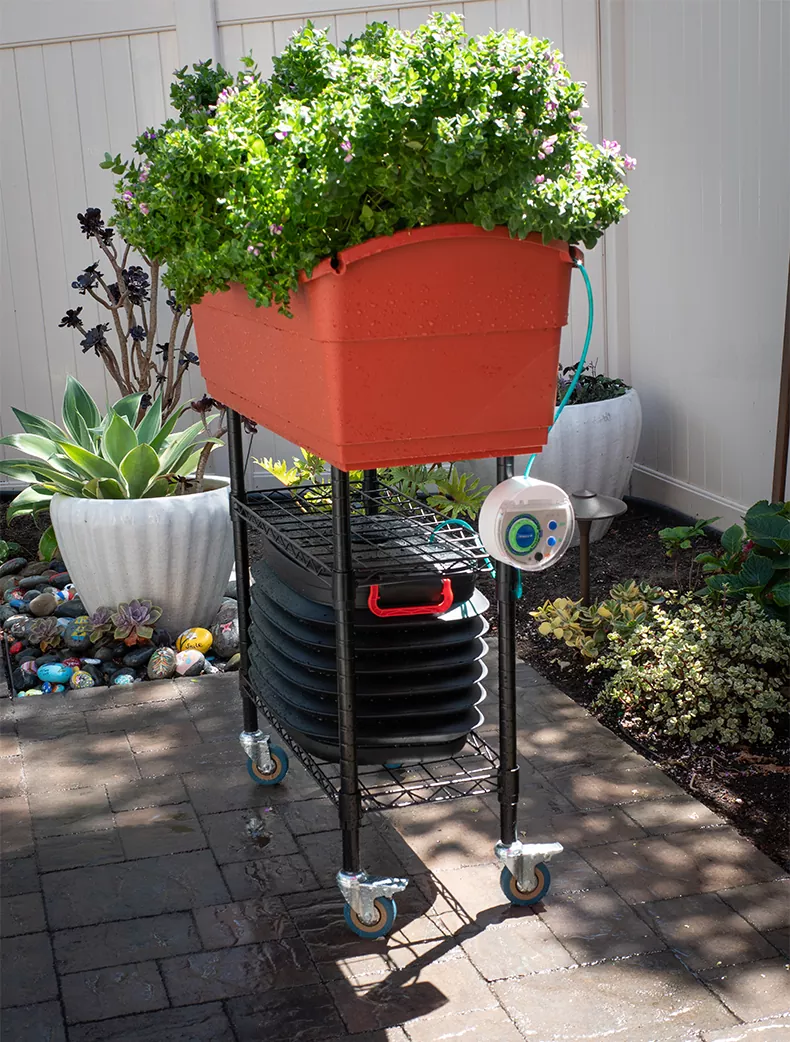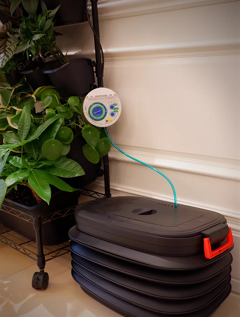 解决您的水源问题,智能浇水 Aquamatic 滴灌套件采用简单优雅的可伸缩桶体设计,方便存放。水箱展开后,可容纳 37 升。密封的水箱盖可以防止蚊子进入。