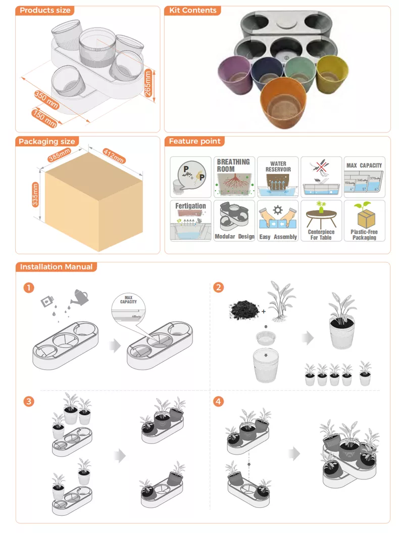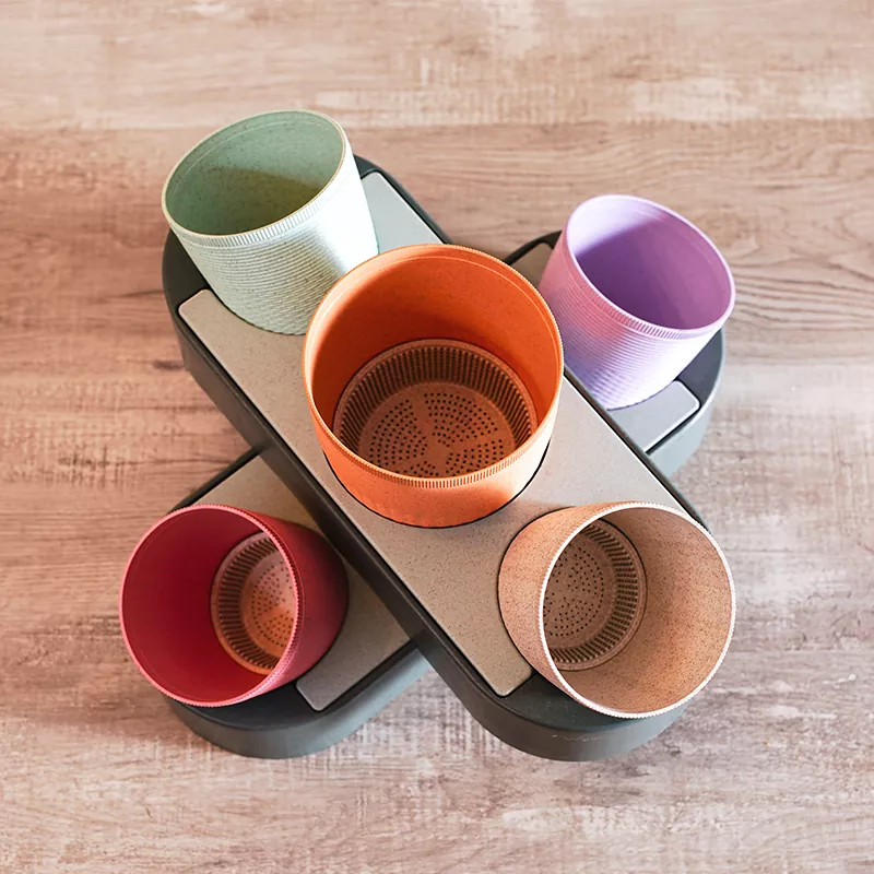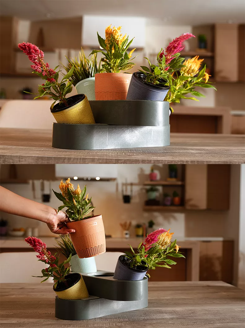 将两个储水底座交叉叠放,然后将花盆放入其中。 Watex 可堆叠桌面花园套件采用优质环保麦秆塑料材料制成,不仅时尚,而且耐用、持久。可堆叠桌面花园非常容易安装,是任何家庭的绝佳补充。